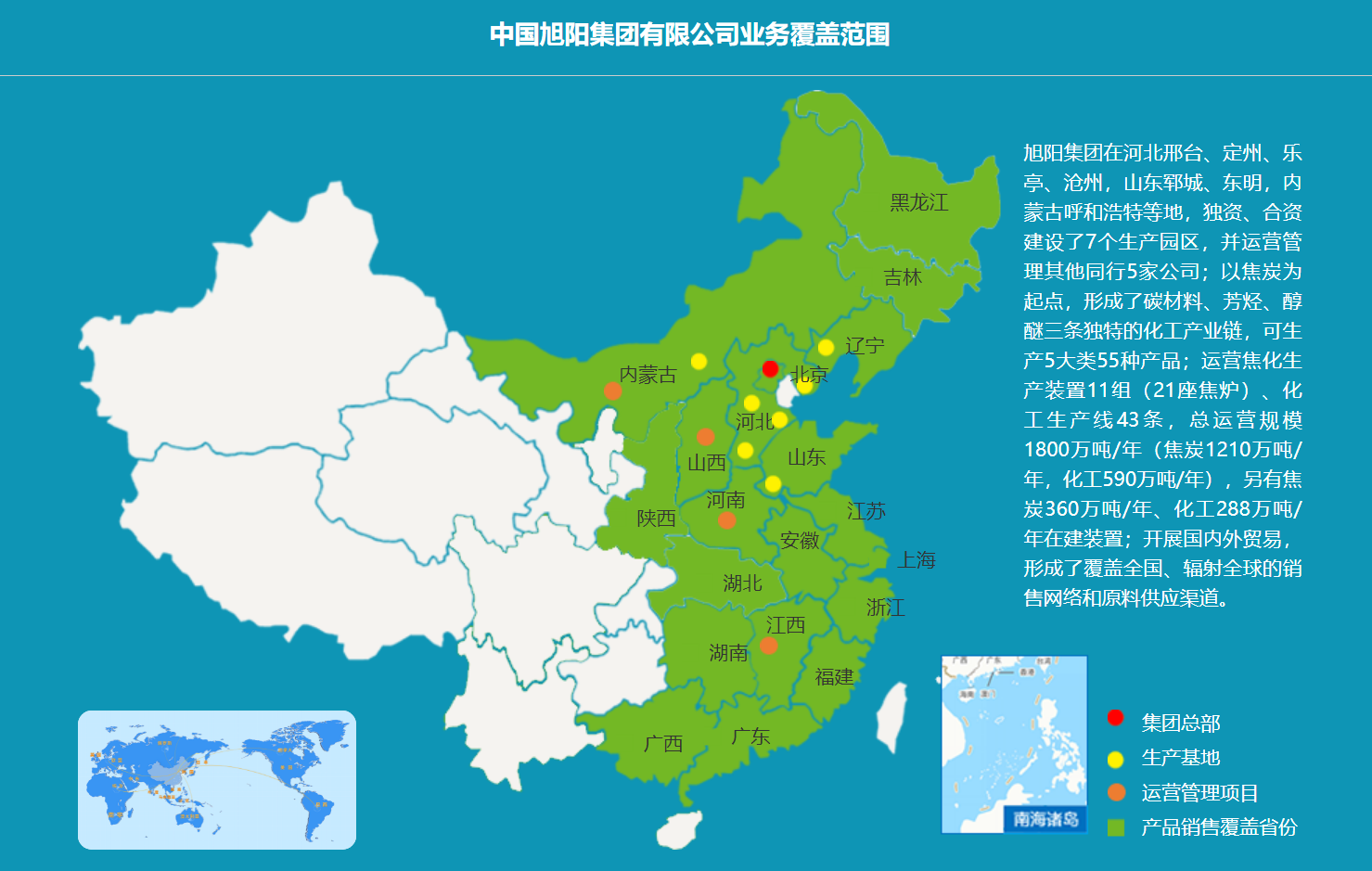 旭陽集團創立于1995年,化工業務是旭陽集團的核心業務之一。公司以焦化為起點,采取縱向一體化業務發展模式,延伸形成了三條化工產業鏈,包括碳材料產業鏈、芳烴產業鏈、醇醚產業鏈。公司化工運營規模590萬噸/年,在建288萬噸/年,分布在河北邢臺、定州、樂亭、滄州,山東鄆城、東明,內蒙古呼和浩特等生產園區。
